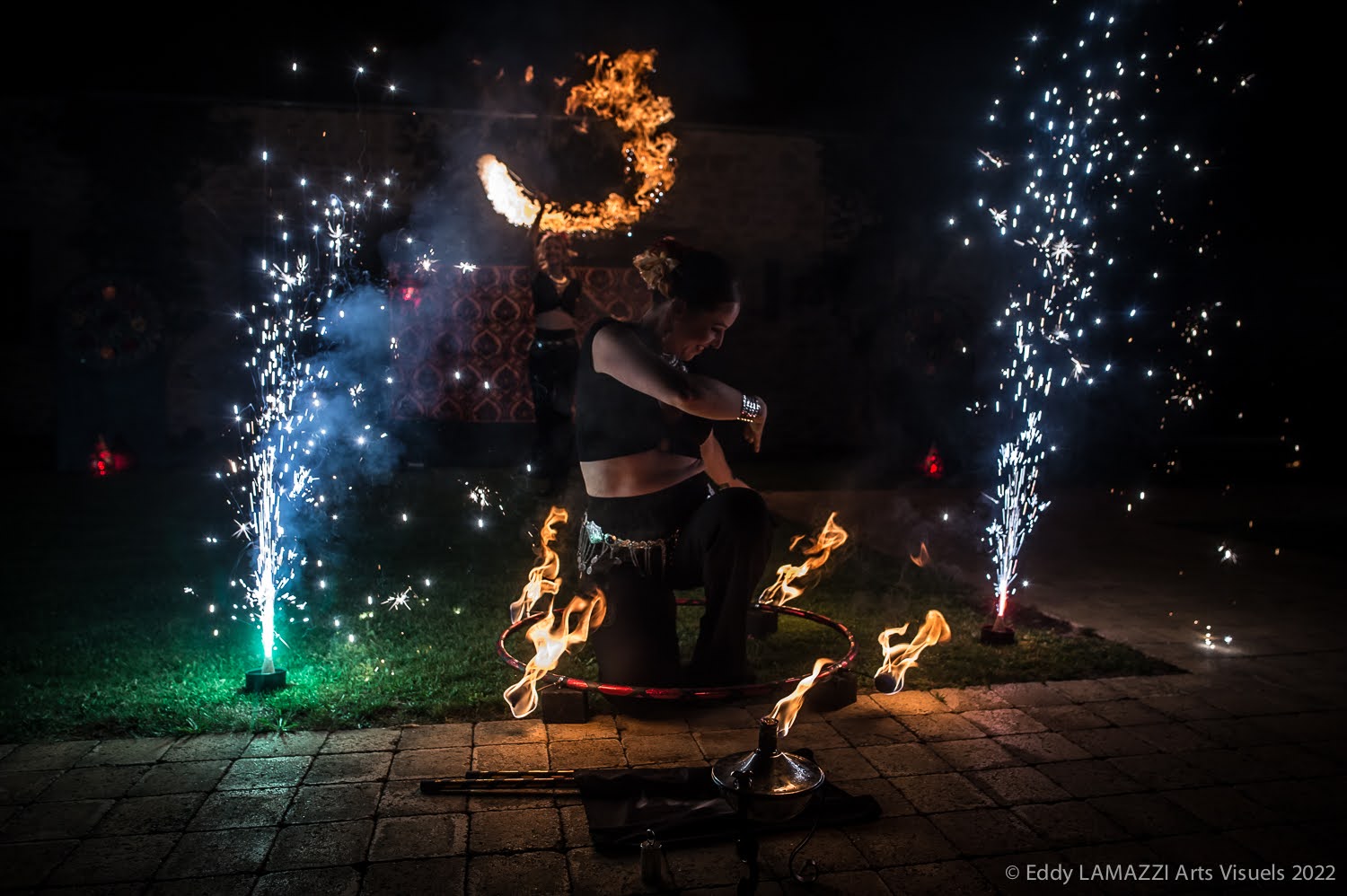 Les danseuses manipulent avec dextérité des agrès de feu et de lumière, elles les font tourbillonner dans les airs dessinant des figures scintillantes aux milles couleurs.