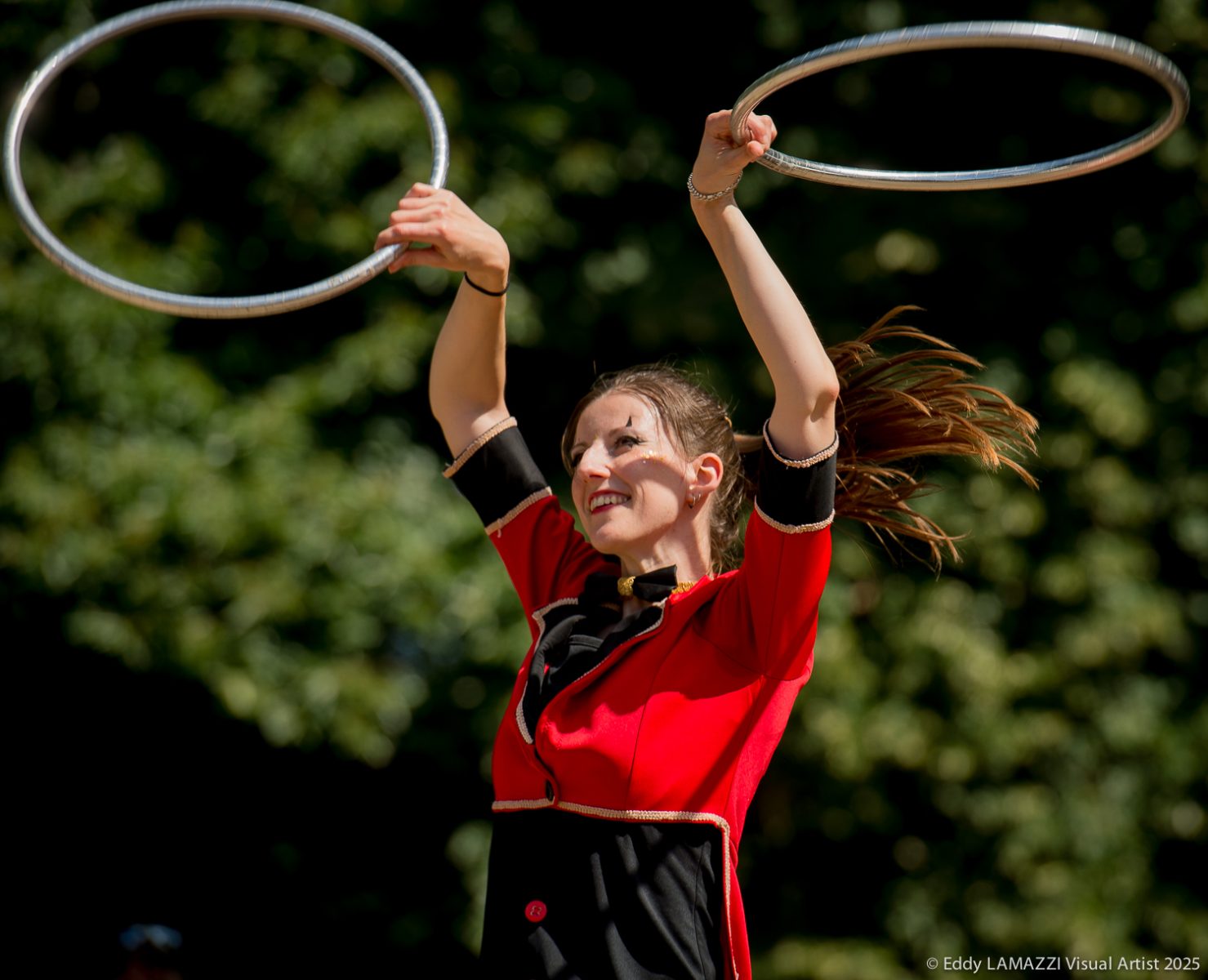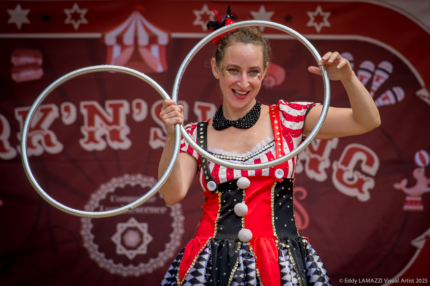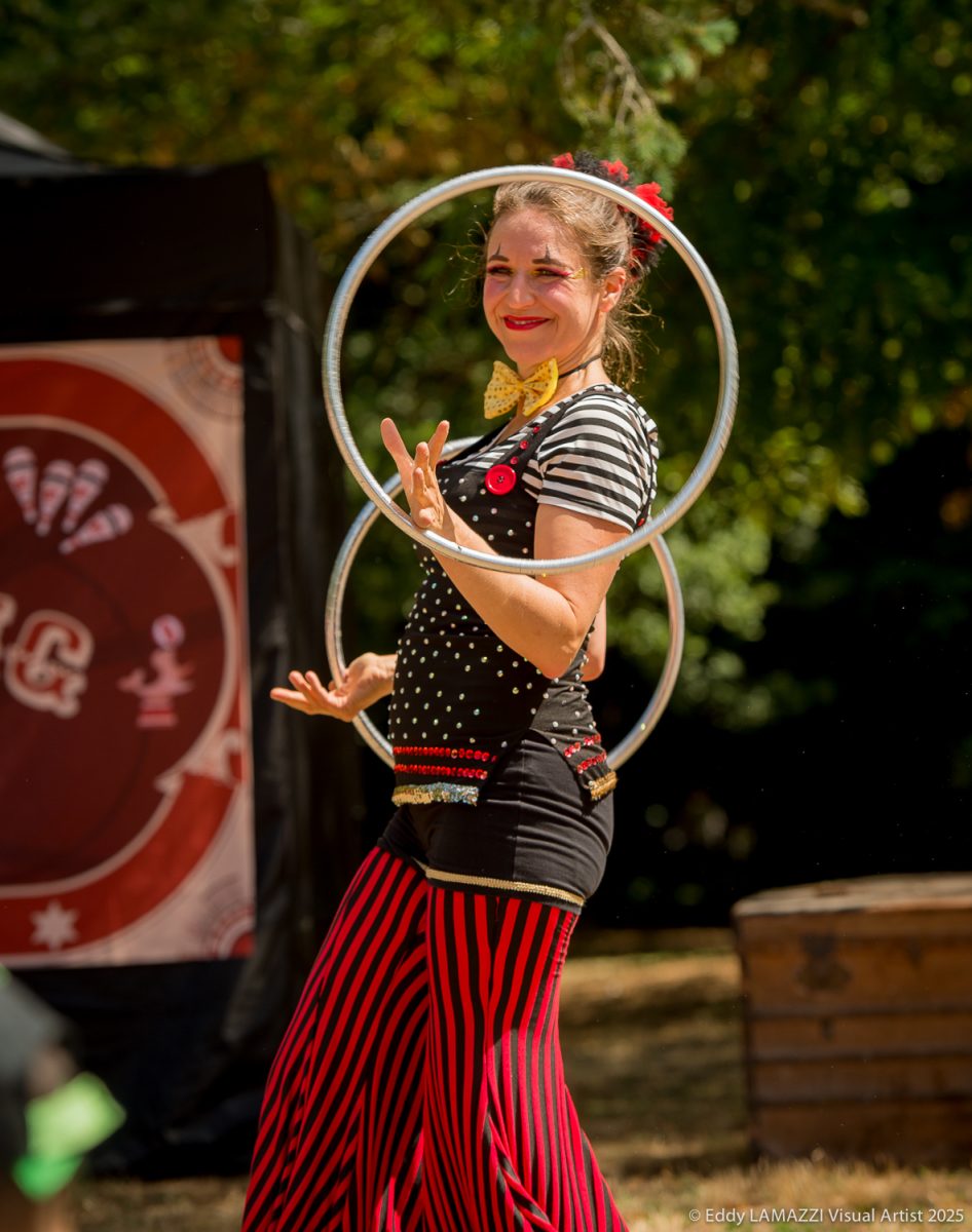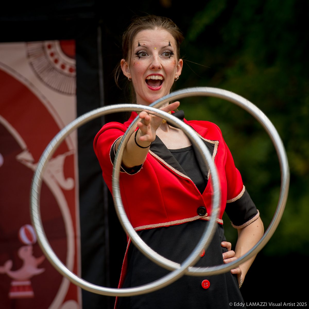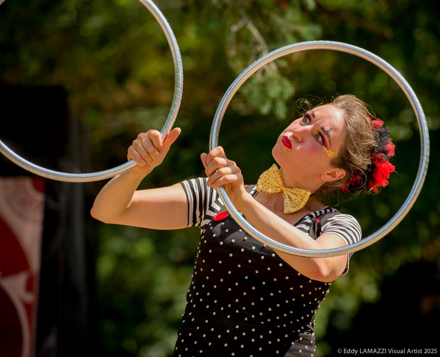 Spectacles colorés de jonglerie, show visuel pour événementiel mais aussi maquillage artistique, ateliers d’initiation au hula hoop et arts du cirque.