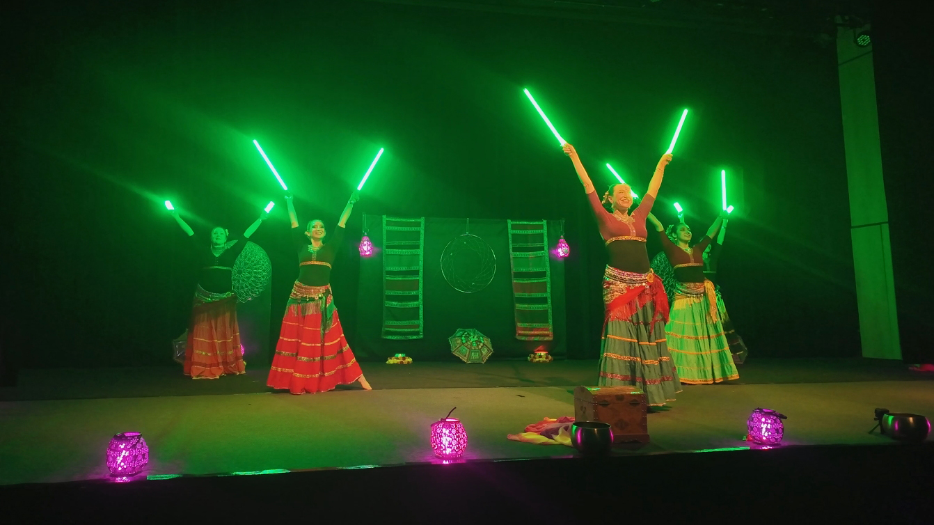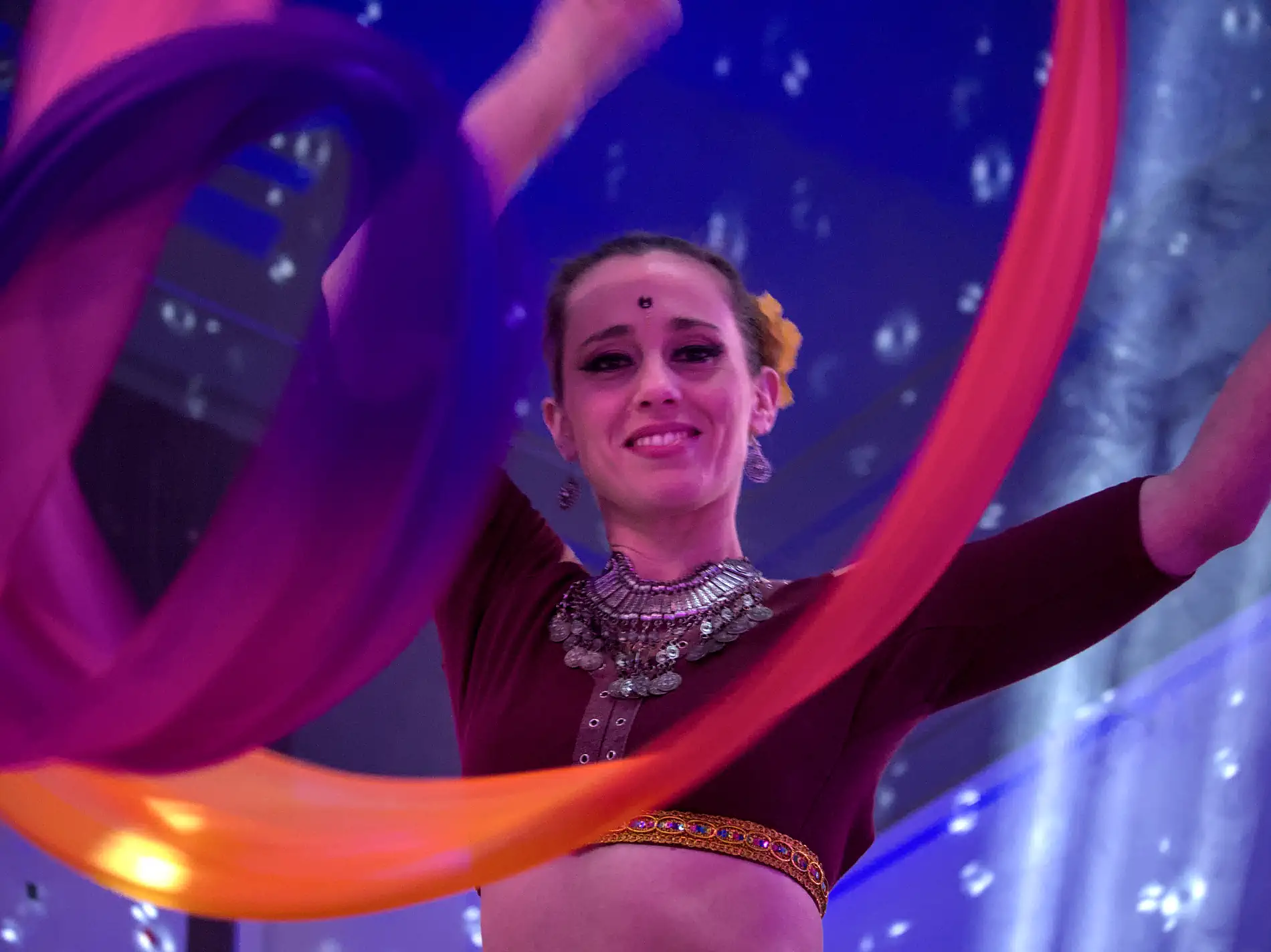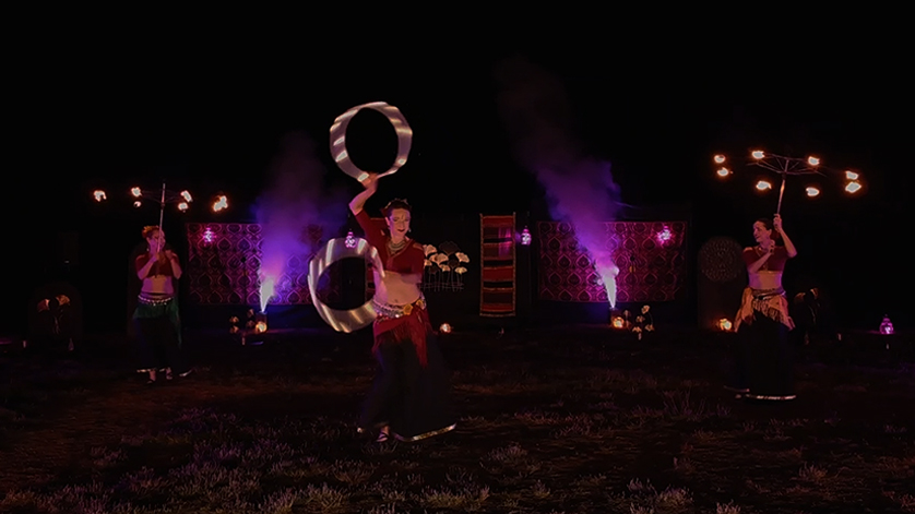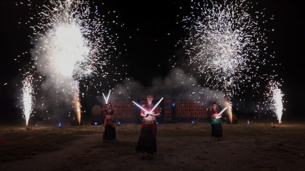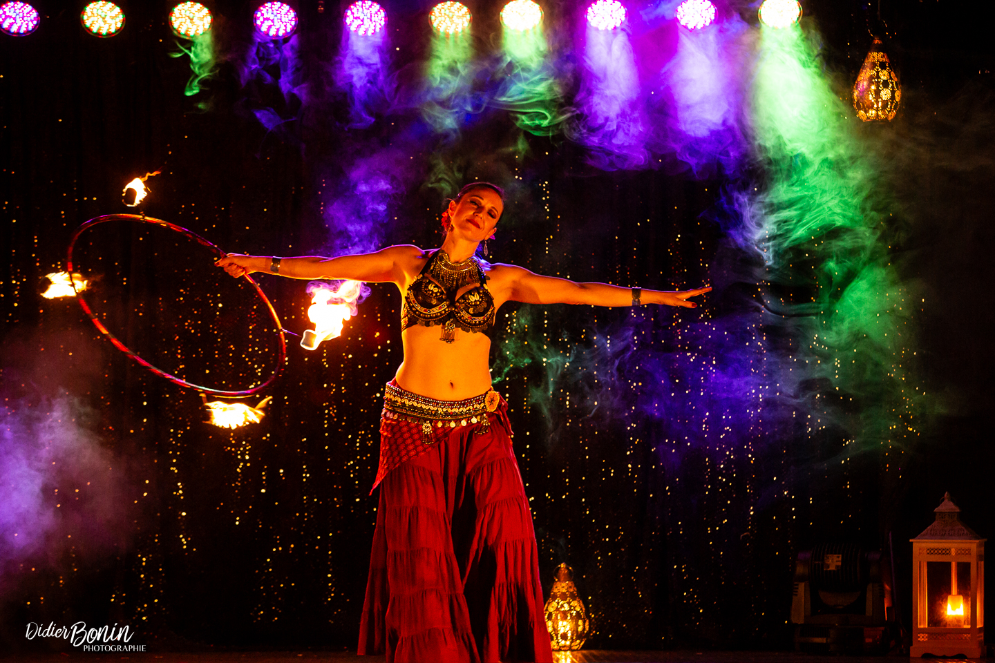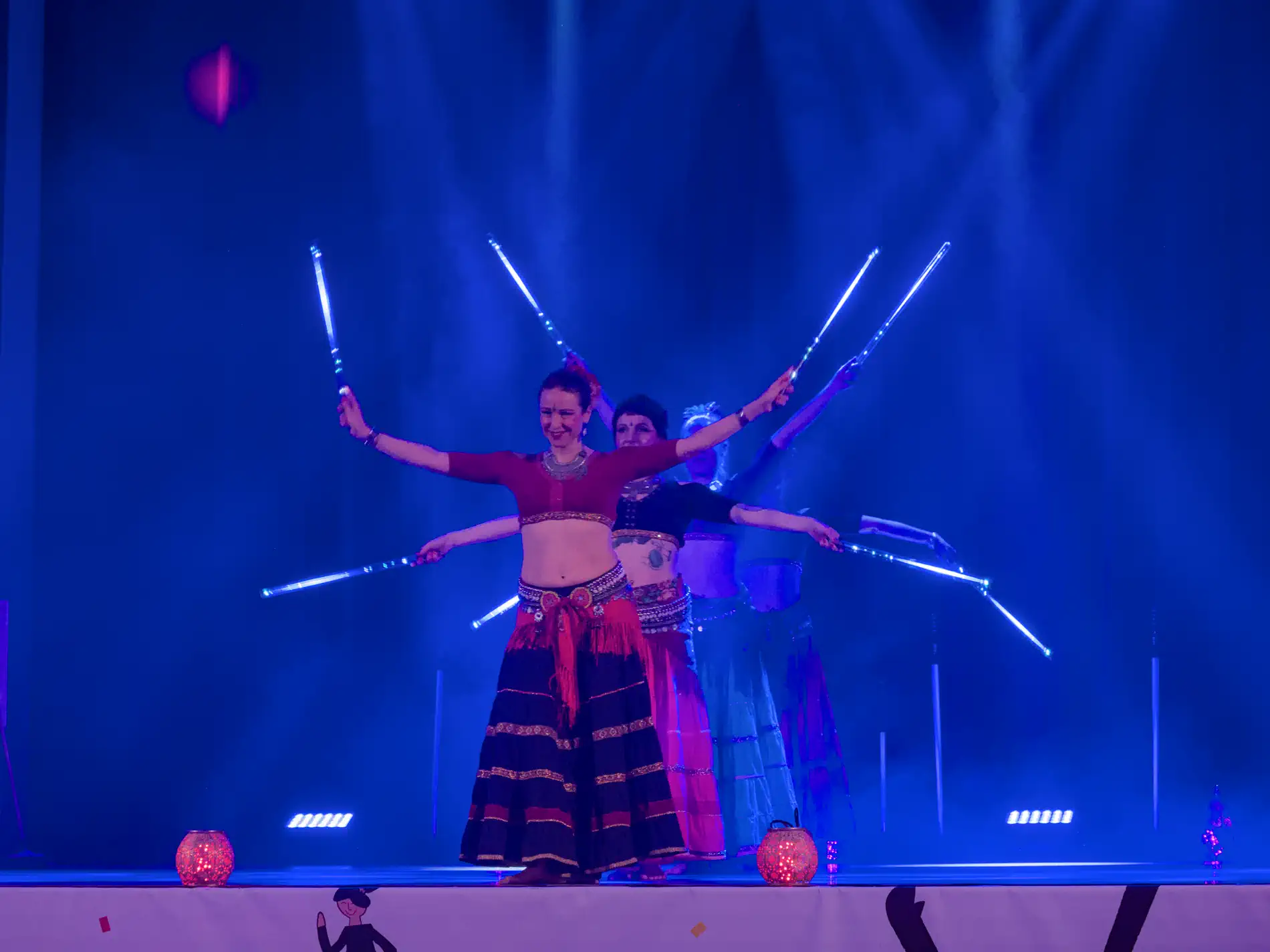 Cette prestation mêle habilement l’univers coloré des danses du monde à la puissance du feu et la magie des lumières.