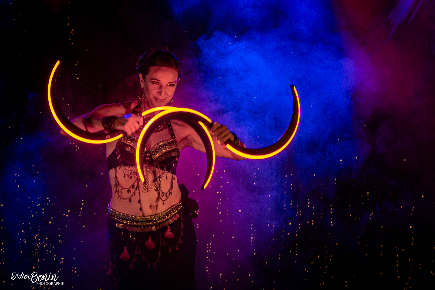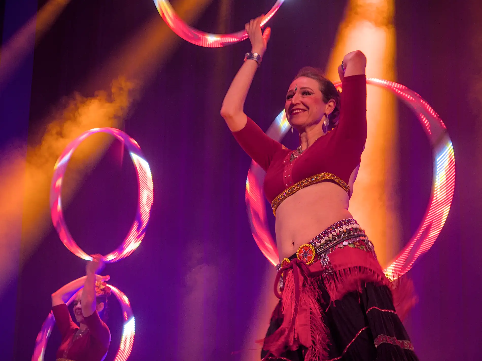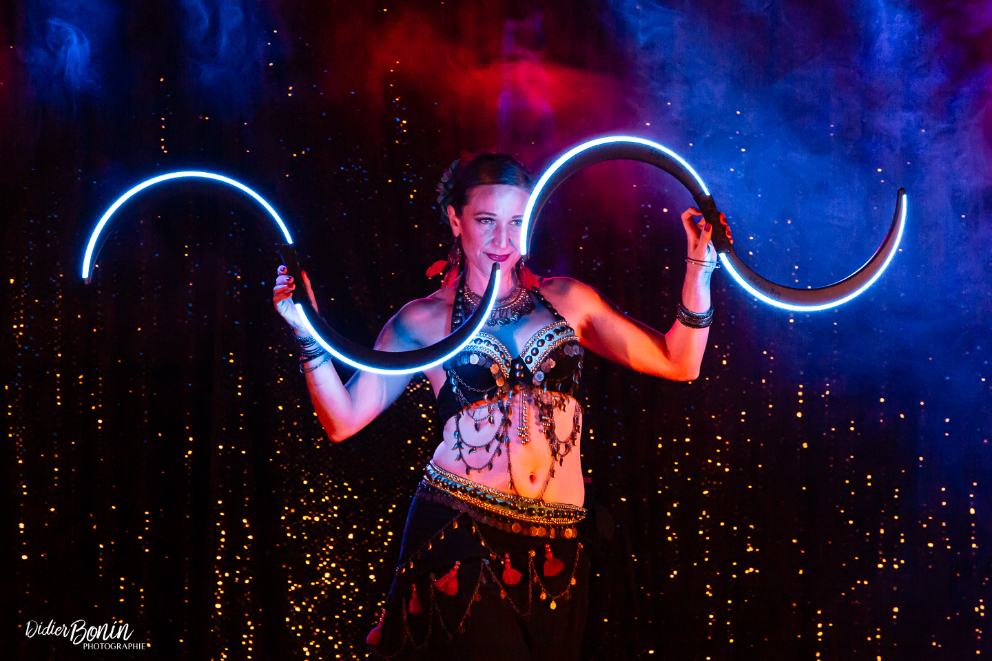 Les danseuses en costumes somptueux manipulent une ribambelle d’objets : hula hoop, éventails de soie, ailes d’Isis, bolas ou même des objets insolites et hypnotiques tels que les buugengs.
